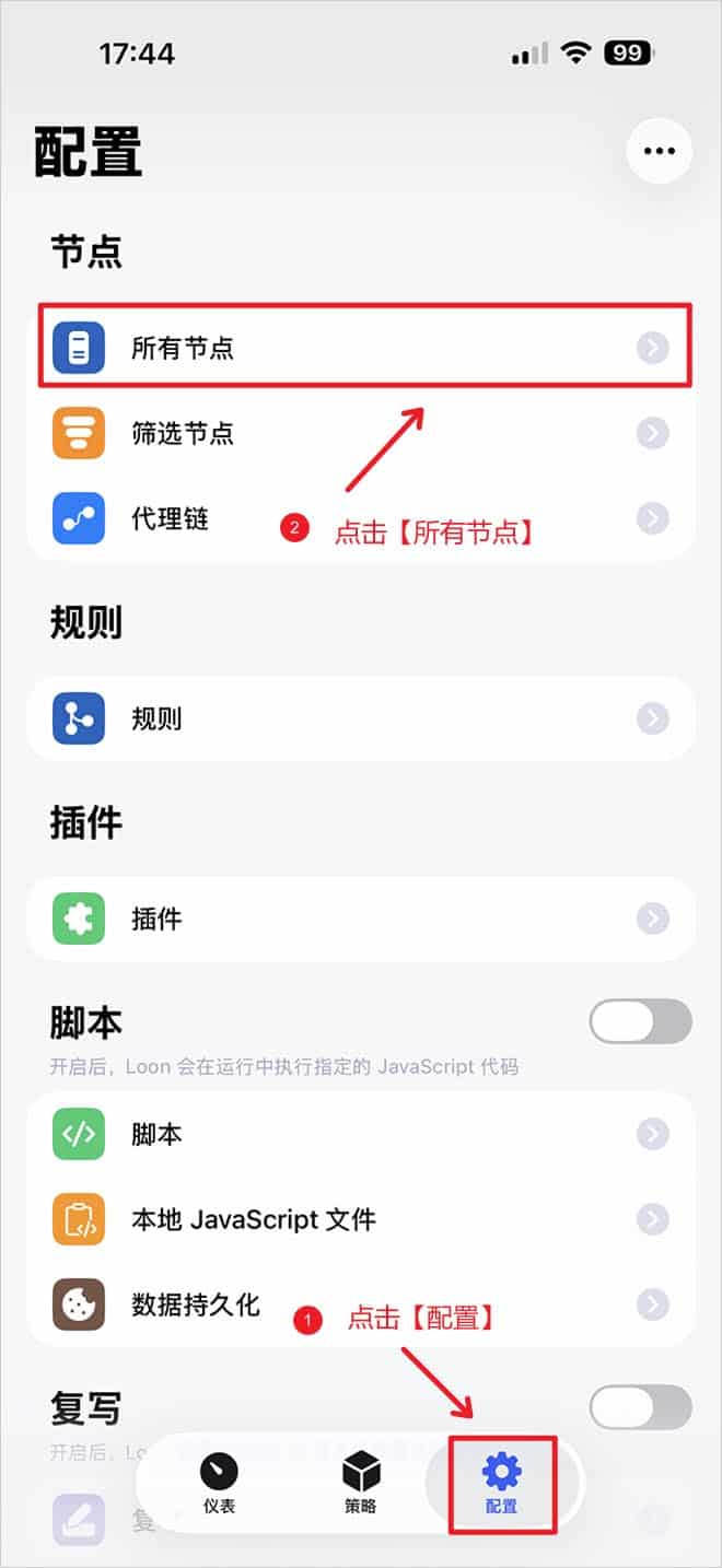 点击软件底部的配置按钮,找到所有节点并点击进入,如下图所示: