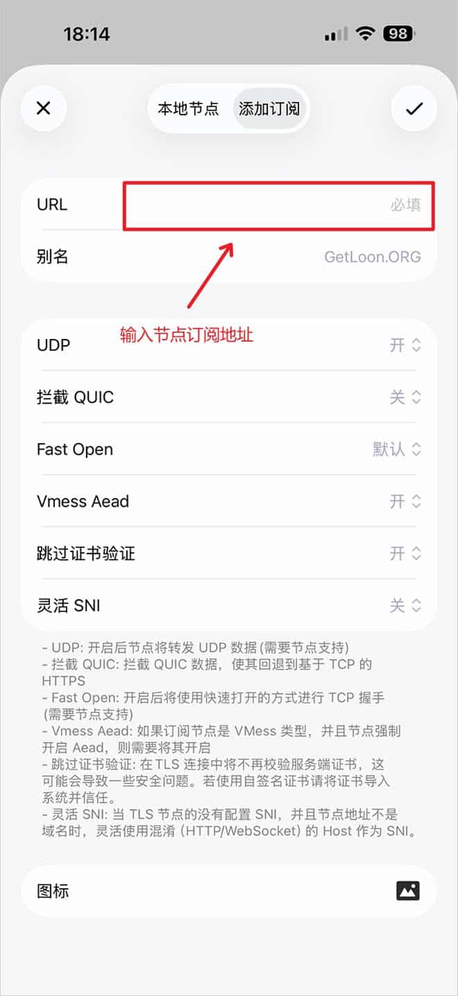 在弹出的添加节点窗口输入节点订阅地址,如下图所示:
